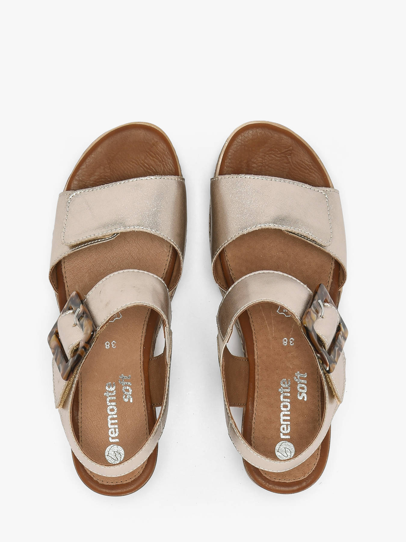 Les sandales à talon compensé de la marque REMONTE séduisent par leur style féminin et leur confort optimal. Dotées d’un talon compensé de 5,5 cm, elles offrent une hauteur idéale pour élancer la silhouette tout en assurant une excellente stabilité. Confectionnées avec un dessus en cuir à la finition irisée, elles apportent une touche lumineuse et élégante à vos tenues estivales. La boucle décorative ajoute un détail raffiné qui souligne leur allure moderne. La doublure en cuir ainsi que la semelle intérieure en cuir et matière synthétique garantissent un confort durable et une sensation agréable tout au long de la journée. La fermeture par velcro permet un ajustement rapide et précis. Faciles à porter, ces sandales sont parfaites pour accompagner vos journées avec style, en alliant praticité, élégance et confort.